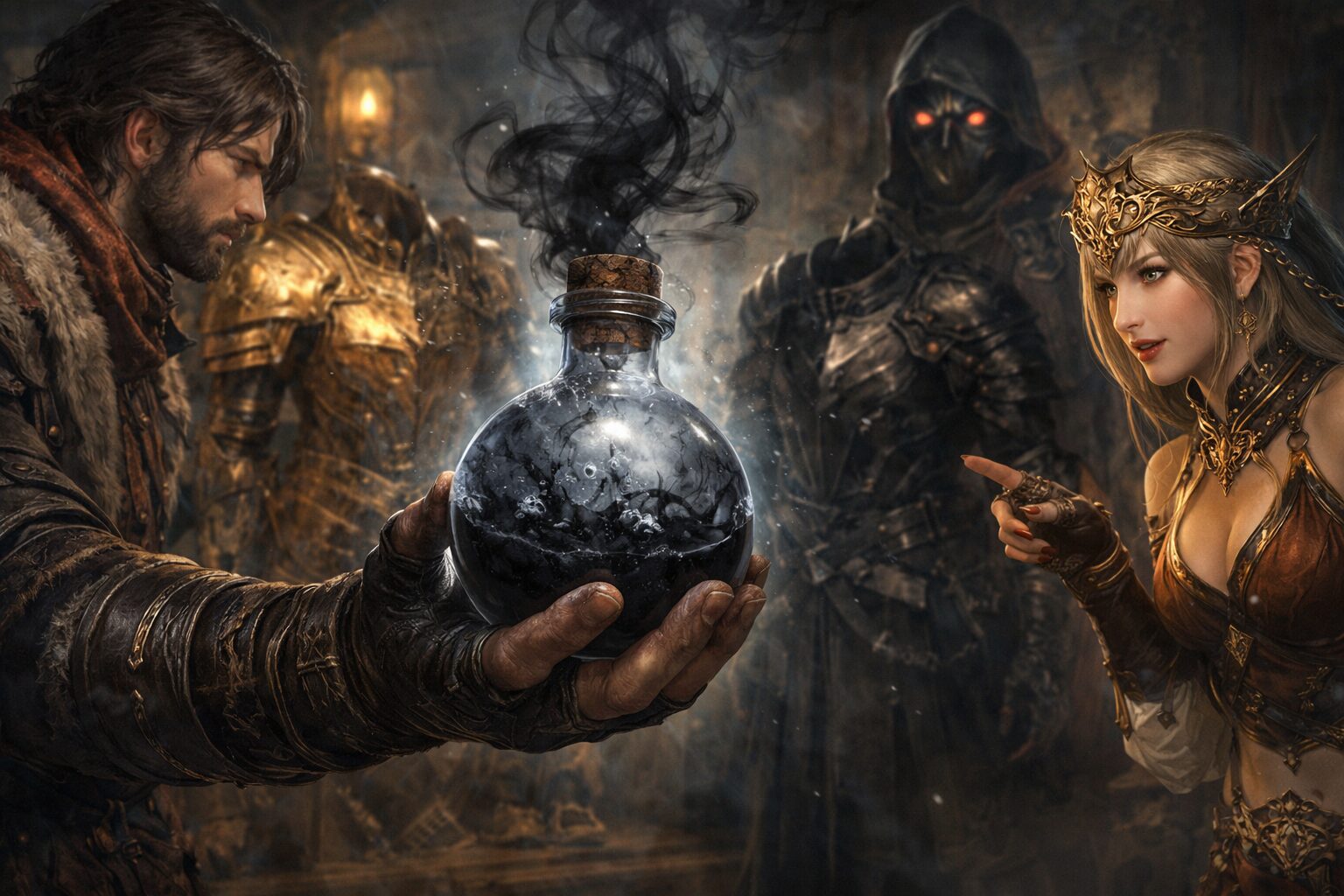 特に派手な金色装備や装飾が多い防具を一気にシックで重厚な雰囲気へ変えることができるため、多くのプレイヤーにとって理想的な外見を作るための必須アイテムと言えます。黒を基調とした装備は戦士らしい威圧感を演出できるため、見た目重視のプレイヤーにとっては最優先で入手したい要素の一つです。