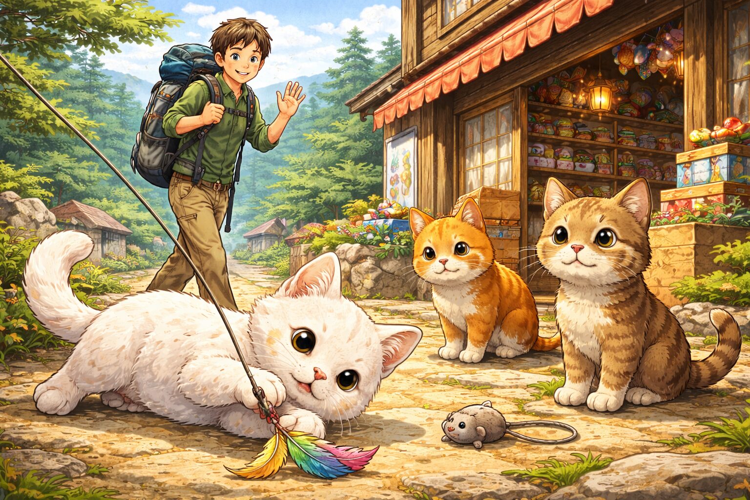 にほんの田舎ぐらしでは、猫と仲良くなるイベントが複数の段階で進行します。最初は餌を与えることで信頼度を上げていきますが、一定の進行後に新しいフェーズとして「おもちゃ」を使った交流が解放されます。