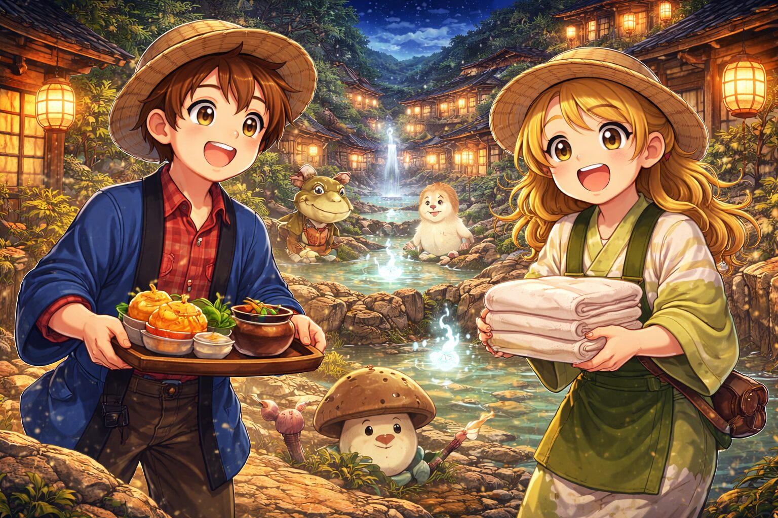 にほんの田舎ぐらしでは、洞窟の奥にある異世界の温泉旅館に迷い込むイベントがあります。この場所では通常の生活とはまったく異なるゲーム体験が用意されており、旅館の従業員として働きながらポイントを集めることになります。