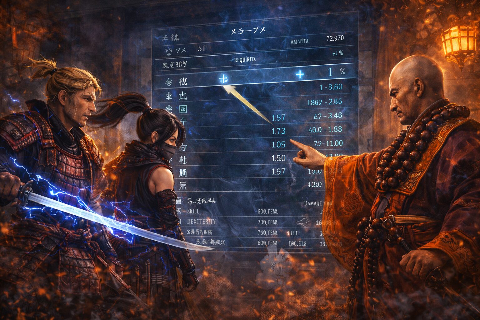 仁王3では、ステータスの振り直しがいつでも簡単に行えます。能力画面で操作するだけでノーコストで再配分が可能なため、最初から完璧な振り方をする必要はありません。まずは序盤を安定して進めることを最優先に考え、その後に装備や魂、立ち回りに合わせて柔軟に調整していくことができます。この仕様を理解しておくことで、ステ振りへの不安が一気に軽減されます。