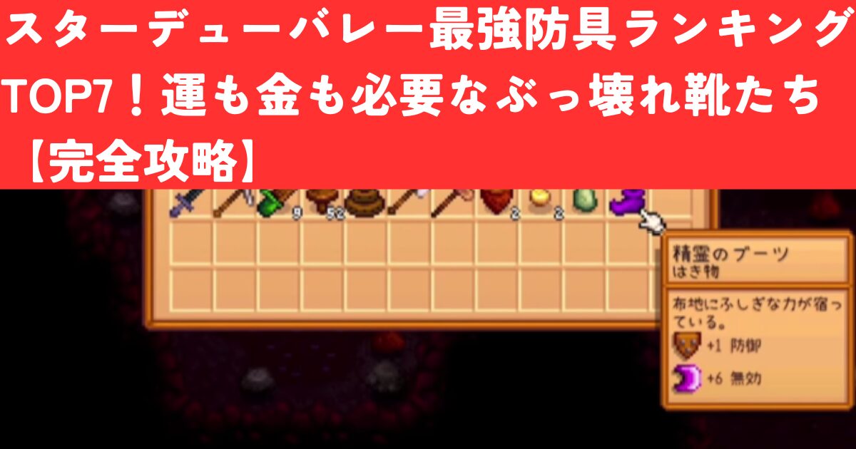 スターデューバレーの「防具=履物」は一見地味に思えますが、実はステータスに直結する重要装備です。以下のように目的に応じて選びましょう。