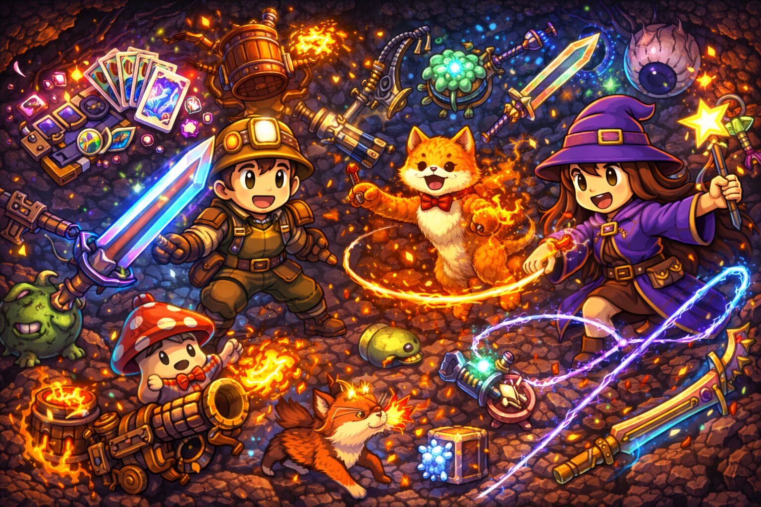 テラリア1.4.5では、過去最大級とも言える量の新武器が追加されました。細かなものまで含めると、その数は30種近くに及びます。今回のアップデートでは、コラボ武器・鞭系武器・それ以外のユニーク武器という3つの大きな軸で新要素が構成されており、単なる火力強化にとどまらず、戦い方そのものを変える武器が多数登場しています。