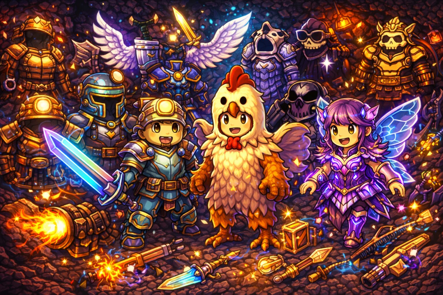 Ver.1.4.5では、ハードモードのトレジャーバッグから入手できる開発者装備が複数追加されています。チキン装備、チキンボーンズ装備、ルーンピクシー装備など、見た目に特化したセットが増加しました。